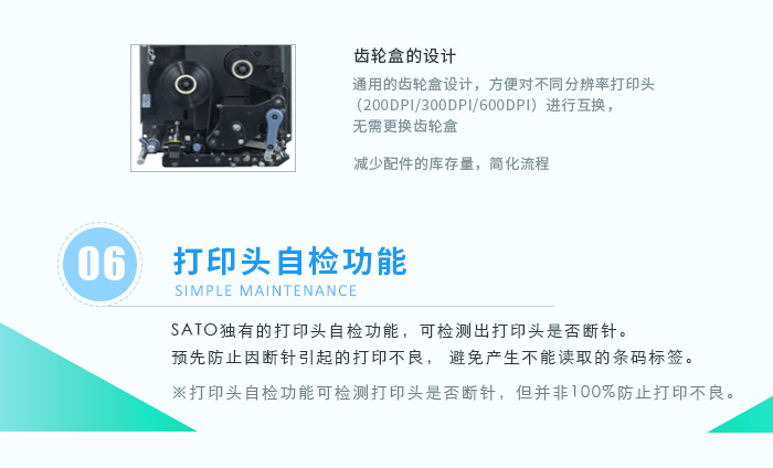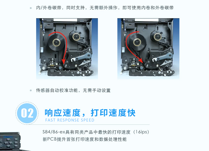 新機型采用了很多新設計方便操作人員去使用,系統方面沿用以確保持續運行。打印頭更換非常簡單緣于無需工具、更長接線且便于檢修。滾軸更換簡單快速緣于環扣設計;傳感器蓋的不粘膠表面設計使工程師或操作人員無需工具就能輕松清潔或更換零部件。