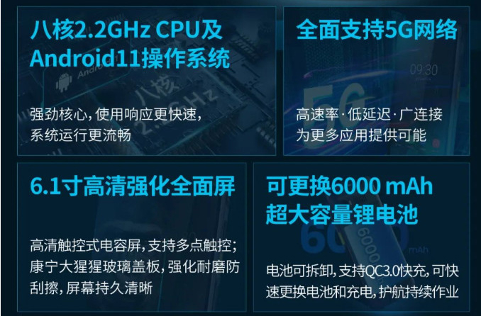 八核2.2GHzCPU及 全面支持5G網(wǎng)絡(luò) Android11操作系統(tǒng) 強(qiáng)勁核心,使用響應(yīng)更快速, 高速率·低延遲·廣連接 系統(tǒng)運(yùn)行更流暢 為更多應(yīng)用提供可能 6.1寸高清強(qiáng)化全面屏 可更換6000 mAh 超大容量鋰電池 高清觸控式電容屏,支持多點(diǎn)觸控; 康寧大猩猩玻璃蓋板,強(qiáng)化耐磨防 電池可拆卸,支持QC3.0快充,可快 刮擦,屏幕持久清晰 速更換電池和充電。