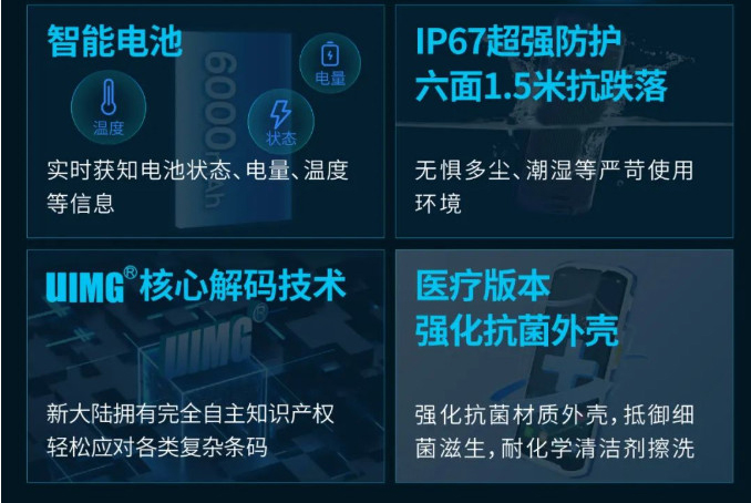 護(hù)航持續(xù)作業(yè) 智能電池 IP67超強(qiáng)防護(hù) 六面1.5米抗跌落 實(shí)時(shí)獲知電池狀態(tài)、電量、溫度 無懼多塵、潮濕等嚴(yán)苛使用 等信息 環(huán)境 UIMG核心解碼技術(shù) 醫(yī)療版本 強(qiáng)化抗菌外殼 新大陸擁有完全自主知識(shí)產(chǎn)權(quán) 強(qiáng)化抗菌材質(zhì)外殼,抵御細(xì) 輕松應(yīng)對(duì)各類復(fù)雜條碼 菌滋生,耐化學(xué)清潔劑擦洗 手套模式 OCR 支持 雙麥降噪 人臉解鎖 智能識(shí)別 Wi-Fi漫游 豐富外設(shè) 匹配更多應(yīng)用場(chǎng)景 手柄 配套手柄使用,優(yōu)化抓握使用方式,有效降低使用疲勞,提升工作效率。