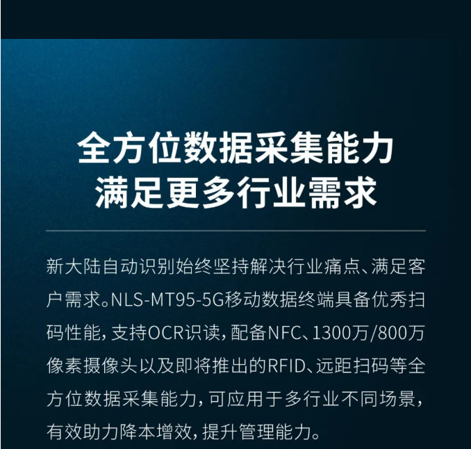全方位數(shù)據(jù)采集能力滿足更多行業(yè)需求 新大陸自動(dòng)識(shí)別始終堅(jiān)持解決行業(yè)痛點(diǎn)、滿足客戶需求。NLS-MT95-5G移動(dòng)數(shù)據(jù)終端具備優(yōu)秀掃碼性能,支持OCR識(shí)讀,配備NFC、1300萬/800萬像素?cái)z像頭以及即將推出的RFID、遠(yuǎn)距掃碼等全方位數(shù)據(jù)采集能力,可應(yīng)用于多行業(yè)不同場(chǎng)景有效助力降本增效,提升管理能力。